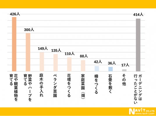 複数回答で回答をいただきました。一番多かったのは「花や観葉植物を育てる」で426人、次に多かったのが「野菜やハーブを育てる」で300人、3番目に「庭木の手入れ」が149人と続いています。個人的には「柵をつくる」が42人、「石畳を敷く」が36人と、本格的なDIY系のガーデニングをされている方もいることに驚きました。