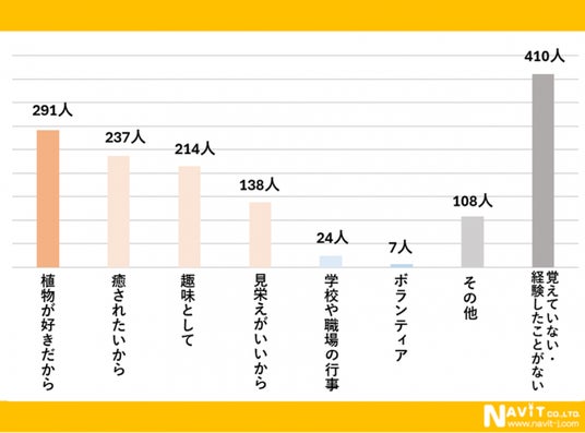 ガーデニングを行う理由についてのアンケートです。一番多かったのは「植物が好きだから」で291人、次に多かったのが「癒されたいから」で237人、3番目が「趣味として」で214人という結果になりました。冒頭で紹介した「ガーデニングが心に効く」という話とつながる部分がありますね。やはり、癒しを求めてガーデニングをしている方は多いようです。