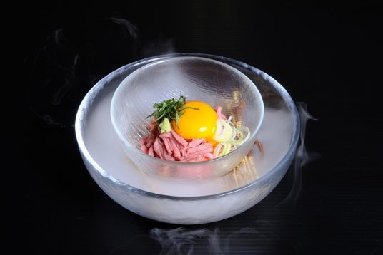 雲海をイメージした演出とともに提供する新感覚ユッケ。
