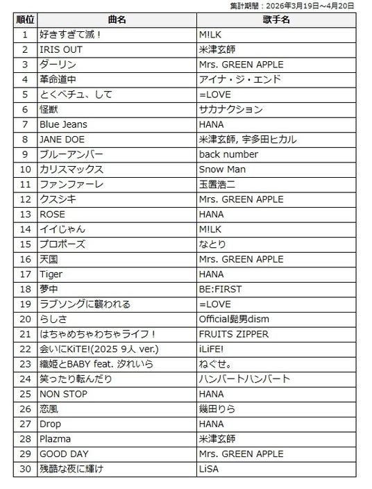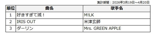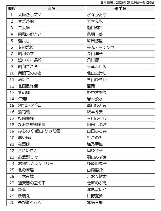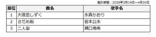 このたび、2026年3月19日から4月20日までのカラオケランキングをもとに【J-Pop部門】および【演歌・歌謡曲部門】の中間結果をそれぞれ発表します。