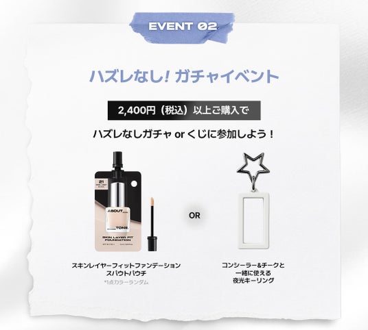 2,400円(税込)以上ご購入で、人気商品のサンプルや、本イベント限定の「オリジナルキーリング」が当たるガチャイベントに挑戦いただけます。